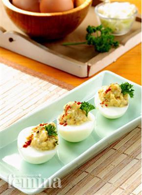 - Isi ‘mangkuk’ putih telur dengan 1 sdm adonan kuning telur hingga rata. Hiasi dengan bawang daun iris dan cabai bubuk. Sajikan.(f)