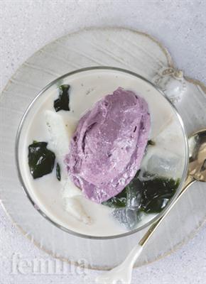 - Penyelesaian: Bagi rata bahan isi ke dalam 6 mangkuk. Beri 1 scoop es krim ketan hitam ke dalam tiap gelas. Sajikan dingin.