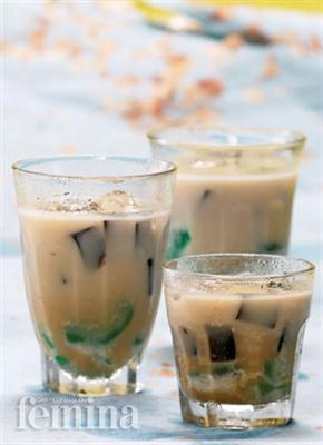 - Penyajian: Taruh potongan cincau dan es batu ke dalam 6 gelas saji. Tuangi campuran susu kedelai dan kolang-kaling. Sajikan dingin. (f)