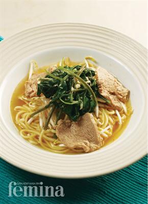 - 300 g mi kuning basah, siram dengan air mendidih