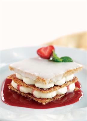 - Penyelesaian: Ambil satu lembar puff pastry, semprot seluruh bagian bawahnya dengan cream. Tutup kembali dengan puff pastry, lalu semprotkan kembali dengan cream hanya pada sisi pinggir puff pastry. Taruh 1 sdt potongan stroberi. Tutup dengan puff pastry. Siram dengan 1 sdm frosting. Sajikan bersama saus stroberi.